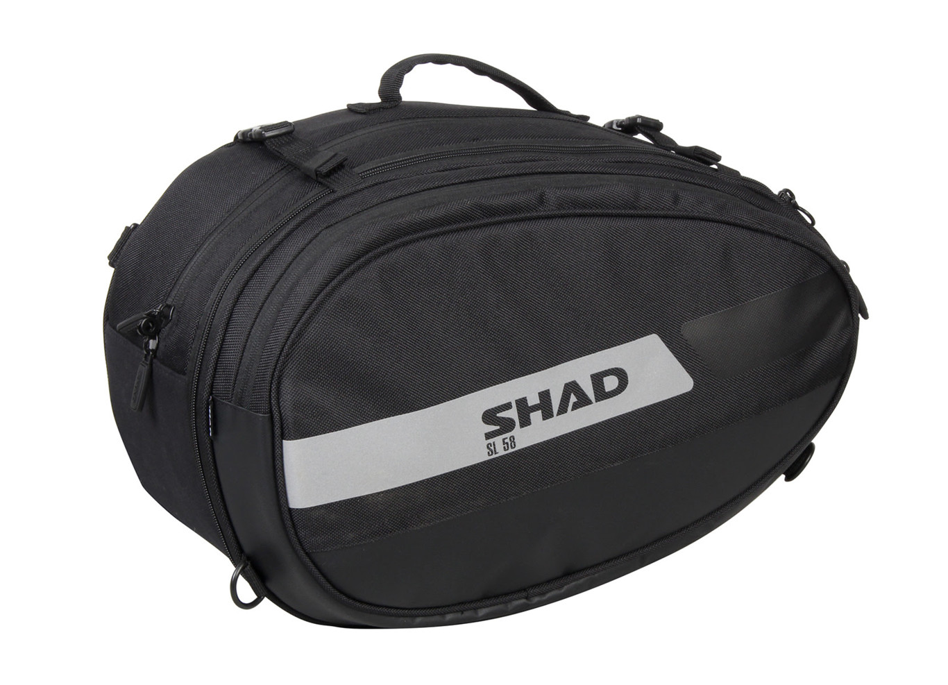 Dentro de la gama de bolsas laterales SHAD SL presentadas a finales del año pasado, encontramos en lo alto por capacidad la SL58. Dotada del sistema de fijación lateral Side Bag Holder que permite enganchar la bolsa mediante tres correas de velcro, se consigue así que no se muevan durante la conducción. Aun así y en caso de no disponer de este sistema, se pueden también instalar con las correas que vienen incluidas y pasarlas bajo el asiento.