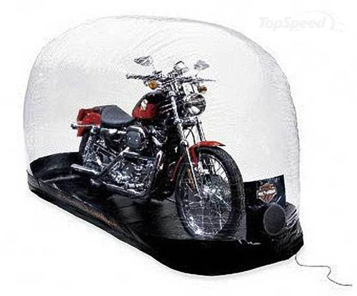 En el mundo de las motos hay muchos obsesionados por mantener su moto en perfecto estado, incluso algunos intentan mantener un estado mejor que cuando la moto salió del concesionario. Además los hay también obsesionados por mostrar a sus amigos/conocidos lo perfecta que está su moto a pesar de los años que han pasado desde que fue estrenada. Para estos últimos Harley Davidson tiene en su amplísimo catalogo de accesorios esta bolsa burbuja para conservar la moto y poder exibirla a la vez.