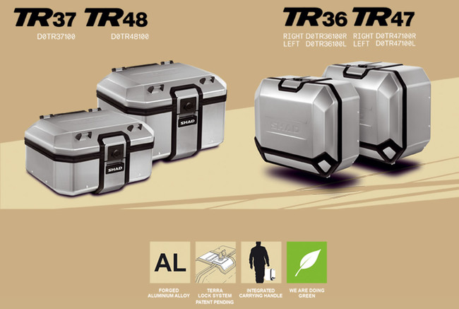 Los juegos de maletas de acabado metálico suelen ir asociados a las motos de tipo trail. Además de reforzar su naturaleza aventurera en cuanto a estética, son más robustos, cosa que es importante si es que el usuario pretende realizar incursiones off-road. En caso de caída, tanto dentro como fuera del asfalto, la posibilidad de una fractura es menor. Las maletas SHAD TERRA son un buen ejemplo de esta apreciación ya que se fabrican en aleación de aluminio forjado de 1,2 mm de grosor que promete un buen compromiso entre peso y resistencia.