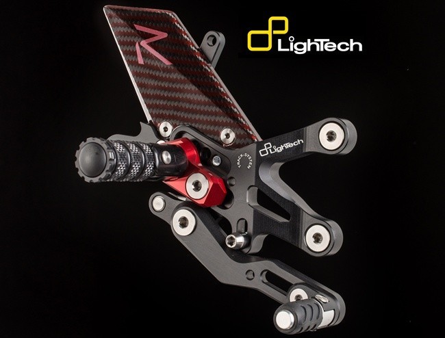 Sin embargo, la versión de estriberas Lightech R cuenta con algunas características adicionales como como los protectores en carbono con trama roja y con el logo R en rojo, reposapiés y punteras plegables, cojinetes SKF de alta velocidad, tornilleria principal en titanio grado cinco y los soportes de los reposapiés en color rojo.