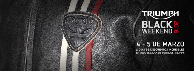 Las marcas cada vez se unen más a esto de los días locos de promociones y descuentos. Ahora le toca el turno a Triumph con su Black Weekend 2016 (y van cinco) los próximos días 4 y 5 de marzo. Los descuentos que se aplicarán en los productos en stock de la boutique de los concesionarios oficiales de la marca irán entre el 15% y el 50%.