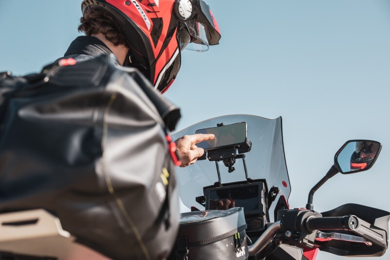 Pero los italianos han pensado en todos. Para aquellos que desconfíen de poner su dispositivo móvil en la moto y sigan utilizando los GPS tipo Garmin o Tom Tom, también pueden hacerlo sobre las bases comentadas anteriormente ya que su fijación es adaptable al modelo original.
