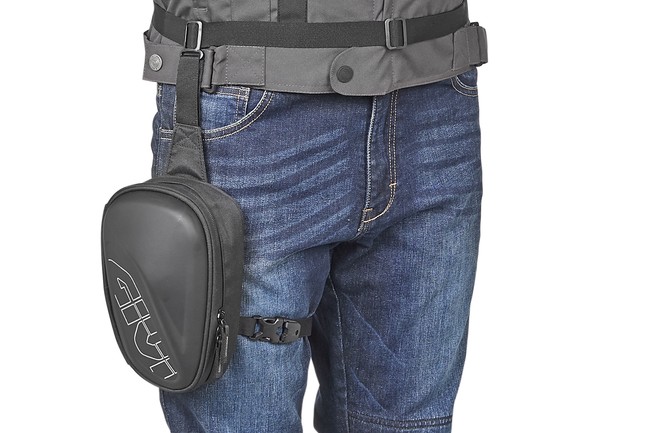 Una opción más que puede resultar bastante práctica es una bolsa de pierna. La GIVI ST608 es una bolsa semi-rígida con una capacidad de 3 litros, más que suficientes para portar los objetos cotidianos y que nos sobre espacio para documentación u otros elementos.