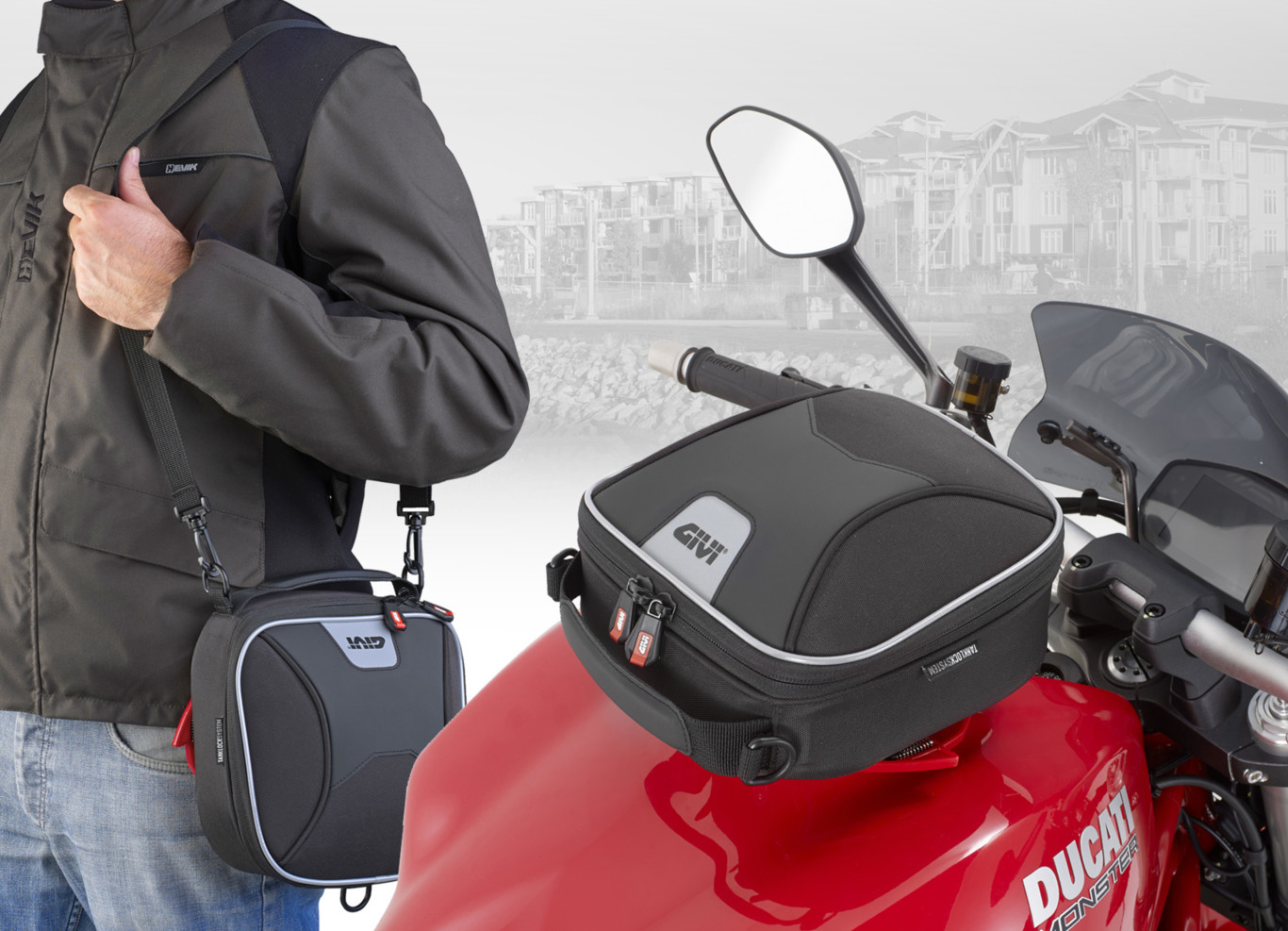 GIVI nos ofrece a través de esta pequeña bolsa sobre depósito de tres litros de capacidad una solución para los que vamos a diario en la moto y no queremos llevar colgando al hombro la socorrida bolsita con los trastos más comunes hoy en día. La GIVI XS319 es una bolsa súper compacta con sistema Tanklock que permite colocarla de manera rápida y segura sobre el depósito de casi cualquier moto. Y al bajar, nos la podemos llevar como una bolsa colgada al hombro.