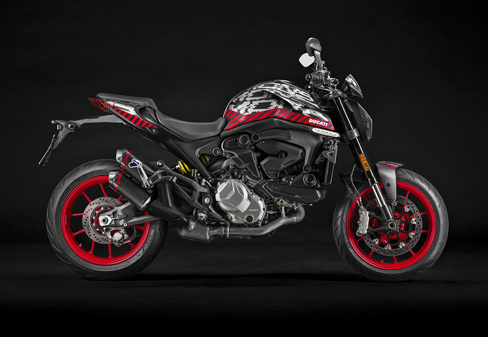 Esta es una Monster moderna y distinta, su chasis a pesar de ser muy bueno y estar derivado de la Panigale V4, no viste tanto como antes por eso han sacado unos juegos de adhesivos con gráficos propuestos por Ducati, que tienen intención de realzar las líneas la Monster.