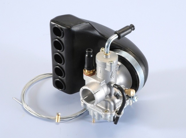 Este carburador viene, al igual que el original montado con la moto, una conexión rígida entre el colector y el propio carburador. El cierre es igualmente con brida y además se suministra con caja filtro y admisión más grande.