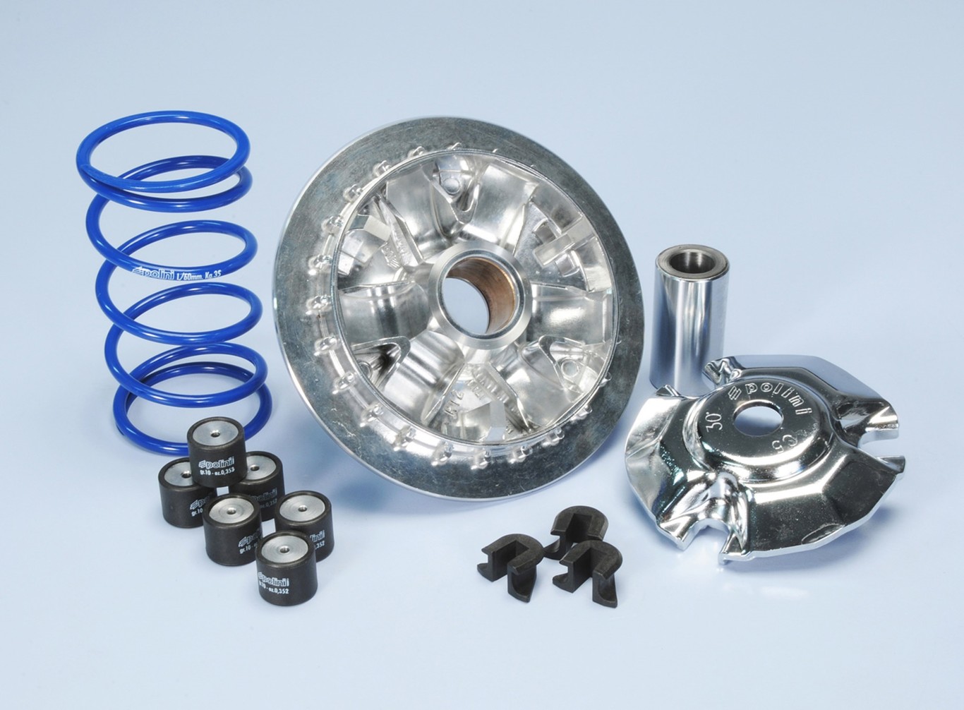 Si pasamos a ver las característiacs del variador Polini Maxi Hi-Speed 530 Evolution para la TMAX, cuenta con una semipolea fija y otra móvil “Air Speed” diseñado con grados distintos para que la correa pueda aumentar su recorrido. Esta correa es más estrecha y corta que la original con lo que se consigue una mayor aceleración.