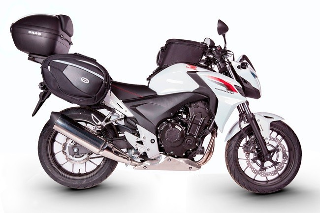 El modelo naked de la serie CB500 de Honda ya ha pasado por las manos del fabricante SHAD con el fin de dotarla de prestaciones más ruteras. La adopción de maletas laterales así como el desarrollo de un anclaje posterior para un top case específico amplía enormemente las capacidades ruteras de la Honda CB500F.