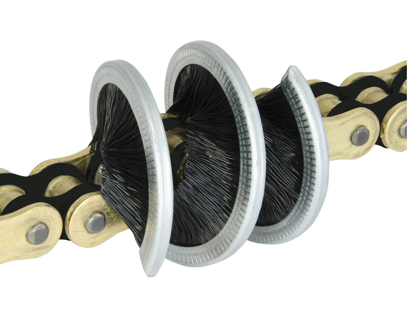 El cepillo golpea la cadena desde todos los ángulos, por lo que alcanza todos los lugares con sus cerdas. Es básicamente sólo una fila de cerdas de nylon montadas en una columna de acero en espiral, moldeable y con la que se rodea la cadena con dos vueltas y media.