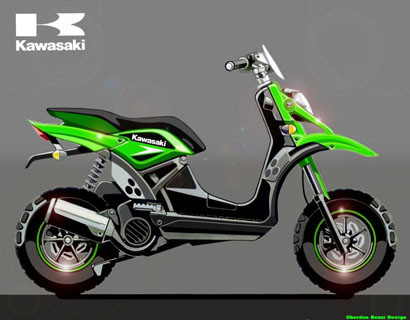 Parece que la única marca japonesa que no tiene ni scooter, ni 50 cc en el mercado, por fin se ha decidido a atacar esa parte del mercado. Y para hacerlo han elegido este scooter de 50 cc de línea muy Kawasaki, que recuerda muchísimo a las motos off road de la marca. El propulsor podría ser el Minarelli 50 cc que tan buen resultado da en muchos otros ciclomotores del mercado, y que tiene un amplio catálogo de piezas disponibles para tunearlo. Muy al estilo de lo que les gusta a los chavales. A mi personalmente me recuerda al Yamaha Slider, por las ruedas de tacos gorditas y las suspensiones altas, pero con mas color. También se rumorea que podría haber una versión 100 cc pero con motor 4 tiempos, para que los más mayores también podamos disfrutar de él.
