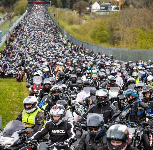 45.000 motos circulando por Nürburgring, o directamente en cualquier circuito, son cosas que pocas veces se ven en la vida. Pues el 'Infierno Verde' (como es apodado) lo ha conseguido, congregando a tantísimos moteros en su ya tradicional Anlassen, que es el evento que abre oficialmente la temporada motera en el circuito.