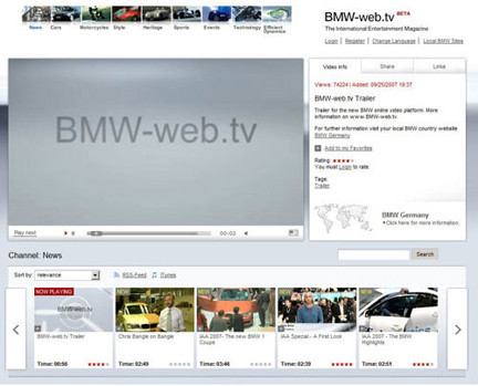 Una página web todavía en fase beta, en el que se cuelgan vídeos de todo tipo relacionados con la marca alemana. Varios canales a tu disposición: coches, motos, deportes, tecnología... en los que podremos encontrar vídeos de reportajes, anuncios, pruebas, etc.