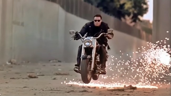 Ponte en situación. Arnold Schwarzenegger, encarnando al T800 y montado a lomos de una Harley-Davidson Fat Boy daba caza al T1000 interpretado por Robert Patrick al volante de un camión Freightliner mientras éste perseguía al joven John Connor (Edward Furlong) por los canales de Los Angeles.