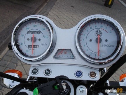 El cuadro de instrumentos es muy tradicional, con dos relojes y unas cuantas luces que nos informan de lo más esencial. En una esfera se nos informa de la velocidad y en la otra de las revoluciones. Un cuentakilómetros total y otro parcial, un indicador por aguja del nivel de gasolina y los indicadores de punto muerto, intermitencia, fallo en el motor y avisador de aceite forman la instrumentación de la YBR 125 SP Classic.
