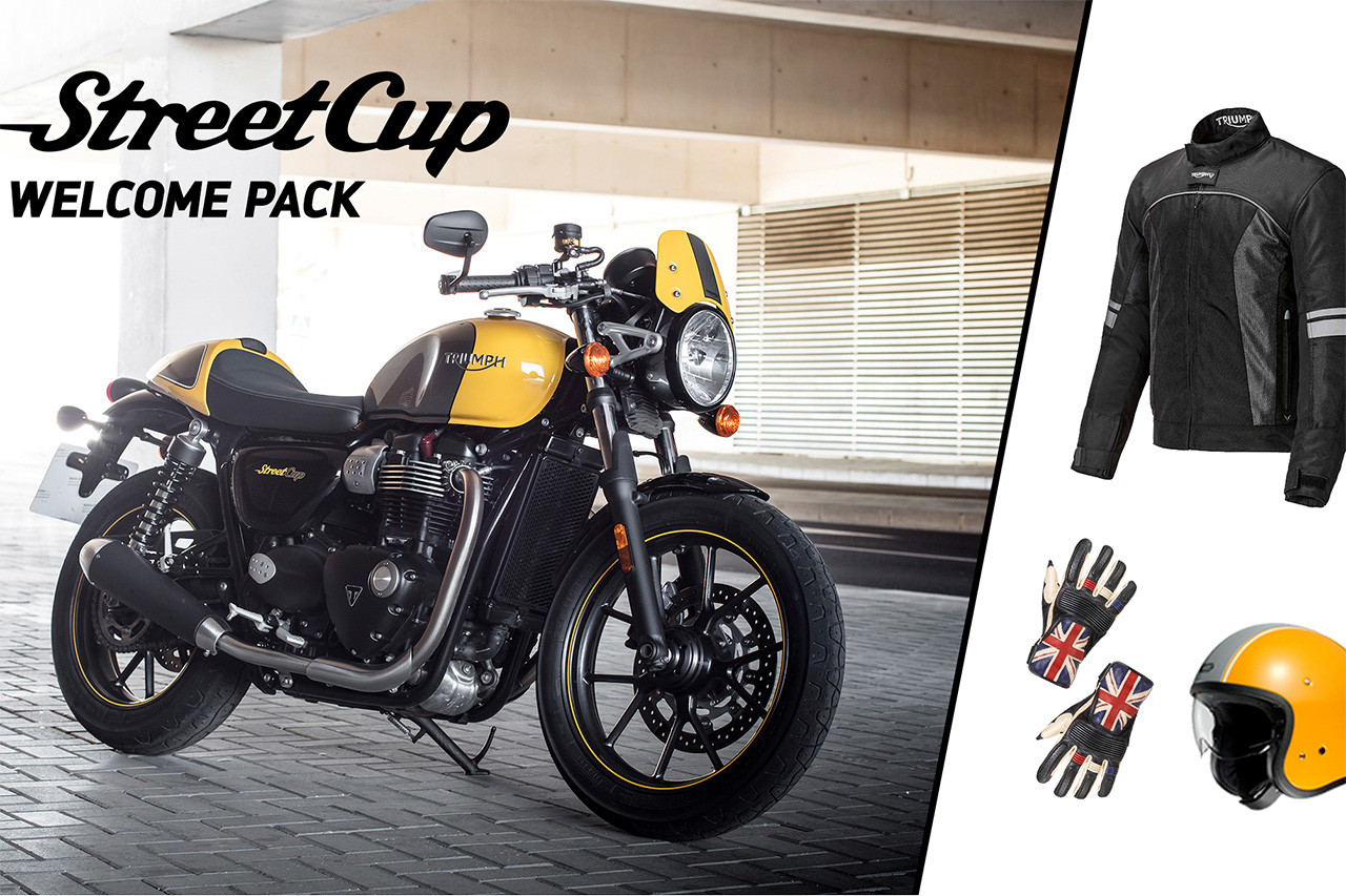 Si estabas pensando en comprarte una Street Cup estás de enhorabuena. En Triumph han decidido ayudarte a tomar la decisión añadiendo a la ecuación un Welcome Pack compuesto por una cazadora, un casco y unos guantes con el más puro estilo Street Racer.