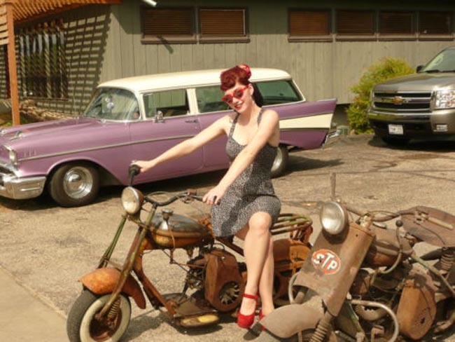 ¿Habéis intentado alguna ver hacer una foto en plan clásico? Yo si, y he de reconocer que los resultados en alguna ocasión ha sido mejor que el que veis en la foto de cabecera. Más que nada porque si te fijas la chica está vestida de época, el Scooter es un Chusman Eagle de 1951, delante de él hay otro de estos artefactos de rueda pequeña bastante oxidado, el coche del fondo encaja en la época. Pero si miramos al fondo a la derecha de la foto podemos ver el morro de un enorme coche (no se si todo terreno o mono-volumen) que nos indica que la foto es actual, muy actual. ¡Con lo que habría ganado el tema con un poco más de cuidado a la hora de encuadrar!