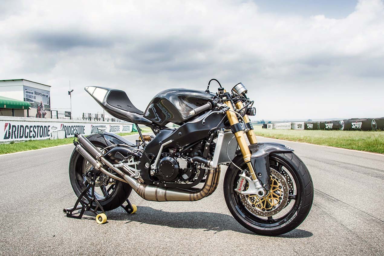 Entre las piezas que provienen de donantes, están las horquillas Öhlins que son de una Ducati Panigale o el amortiguador trasero del mismo fabricante, un Öhlins TTX. Los frenos son unos Brembo con discos de 320 mm en la parte delantera y mordidos gracias a una bomba RCS19. Las llantas son unas BST fabricadas en fibra de carbono y completan la lista de elementos pata negra de la Yamaprilia.
