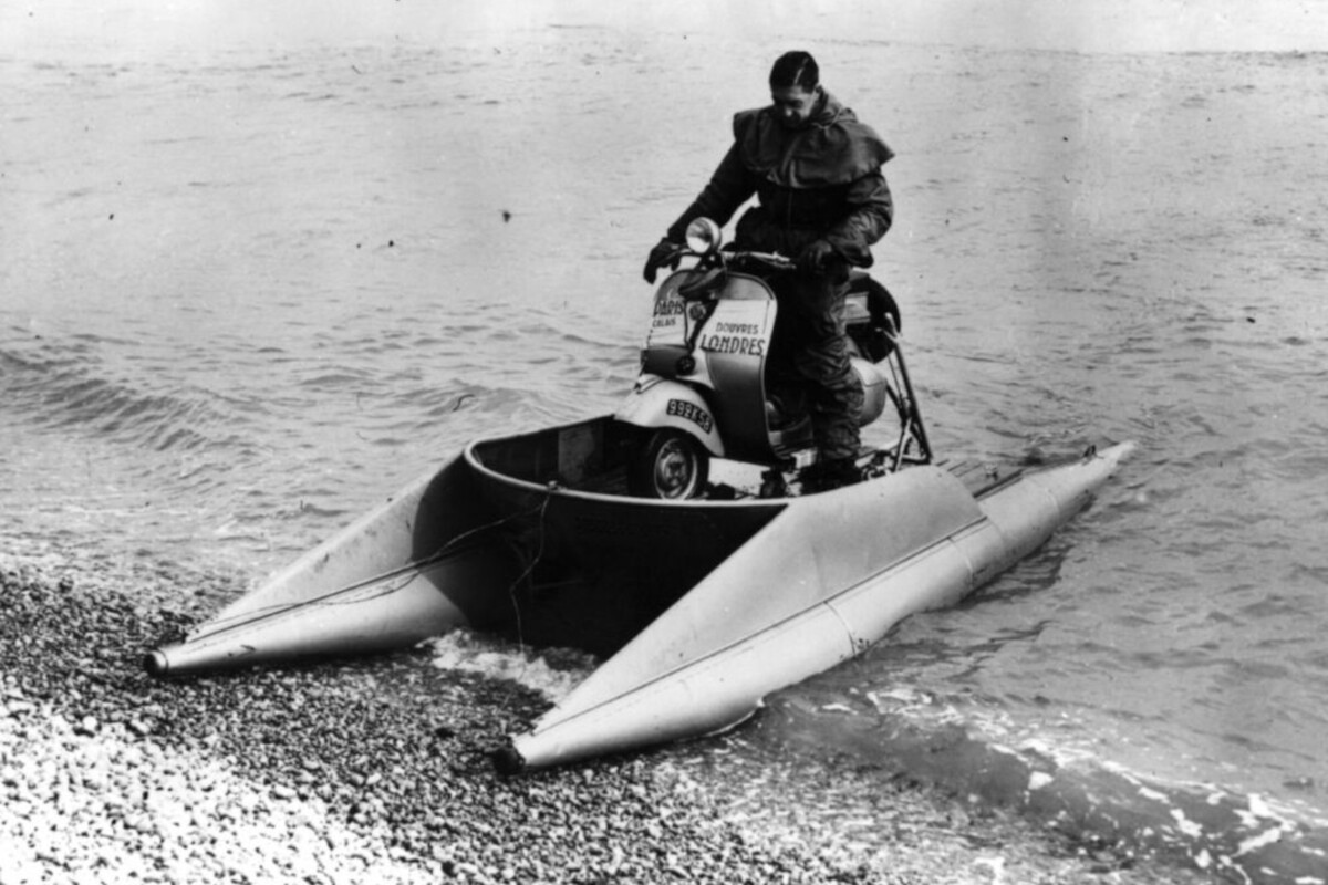 Monneret fue uno de los primeros en convertir su viaje en espectáculo. Cada modificación de su Vespa era una mezcla de ingeniería, intuición y pura locura. Como cuando cruzó el Canal de la Mancha en una Vespa con hélice y tracción acuática.