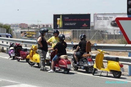 A eso de las 10:00 h de la mañana llegábamos mas o menos todos al punto de reunión, donde llenamos los depósitos y tras tomar un café nos pusimos en ruta. La idea de esta ruta es que la puedan aprovechar los “novatos” que quieren apuntarse al club para rodar con el grupo mas veterano y que se conciencien así de que sus motos (la mayoría de veces Vespa) pueden hacer kilómetros sin problemas por carretera. Este tramo que hacemos cuenta con unas vistas bastante bonitas de la ciudad de Alicante y el mar, y en las zonas que miran al norte puedes disfrutar de la típica montaña alicantina con almendros en los cultivos y pinos en las zonas mas salvajes. La pena es que este año, todos los “novatos” que habían avisado que venían se fueron echando atrás y al final no apareció ninguno.