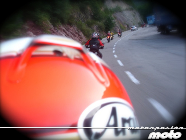 Ya metidos en faena por carreteras francesas más retorcidas que la mente de Anthony Perkins en Psicosis y como diría un castizo: no se ve un clavel. Me dejo llevar por la luz de la moto que tengo delante y no llego a ver ni la línea divisoria de la carretera. El ápice de la curva tampoco se vislumbra ni por asomo y esto es una locura. Voy tan concentrado en el que tengo delante que me fatigo mentalmente. Parecemos fichas de dominó, como se salga uno, vamos todos detrás. Me encuentro en el medio del pelotón, no soy de los más rápidos ni de los más lentos pero el de la Triumph Bonneville me acaba de arrancar las pegatinas de mi Ducati Monster 696.