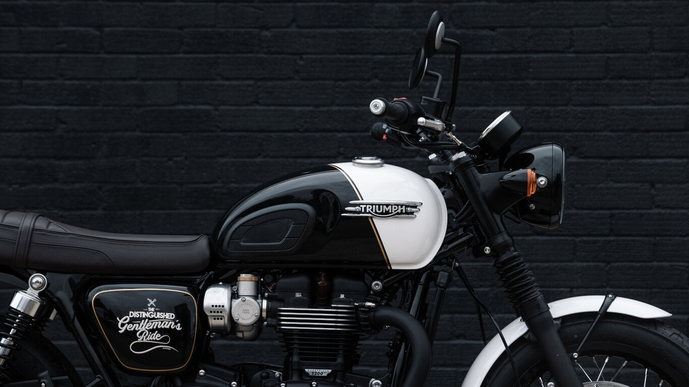 La Bonneville T120 T120 Black Distinguished Gentleman’s Ride Limited Edition viene con una estética más elegante y exclusiva que nunca. Inspirada en los trajes de caballero requeridos en los códigos de vestimenta de las cenas de gala más distinguidas, su esquema de pintura metálica combina los colores Phantom Black y Crystal White con detalles con líneas doradas pintadas a mano.