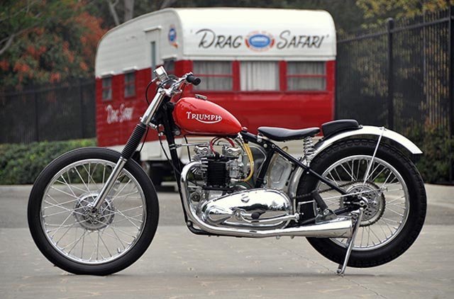 La moto, llamada Pretty Boy II, es una Triumph Thunderbird 650 dragster de 1952, y las fotos que vemos en este post pertenecen a la última restauración que ha hecho el propio Bobby sobre la moto original que preparó Fred Ford en los años cincuenta. El listado de mejoras realizadas en el motor pasa desde unos muelles reforzados en las válvulas, árboles de levas Iskenderian, pistones de alta compresión y un par de carburadores con boya separada para alimentar el motor.