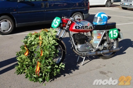 “Los hombres como Ricardo Tormo no mueren nunca” y vaya si tenia razón Luca Cadalora cuando dijo esto sobre el campeón español. Lo que más llamaba la atención del paddock del circuito de Cheste este fin de semana era la Ossa 250 parada allí en medio con el número 15 sobre fondo verde y una leyenda en el depósito que decía R. Tormo, sobre su asiento descansaba un casco Clímax azul y apoyada en su rueda delantera había una corona de laurel. En las horas que estuve por allí, fueron muchísimos los que se acercaban a hacerse fotos con esta moto, pero el que más me llamó la atención fue un padre que puso delante de ella a su hijo de cinco o seis años para hacerle una foto con una moto mítica de un piloto mítico. Y todo esto gracias a la labor que año tras año desarrolla Nacho Santos organizando esta “locura” con motos clásicas de competición.
