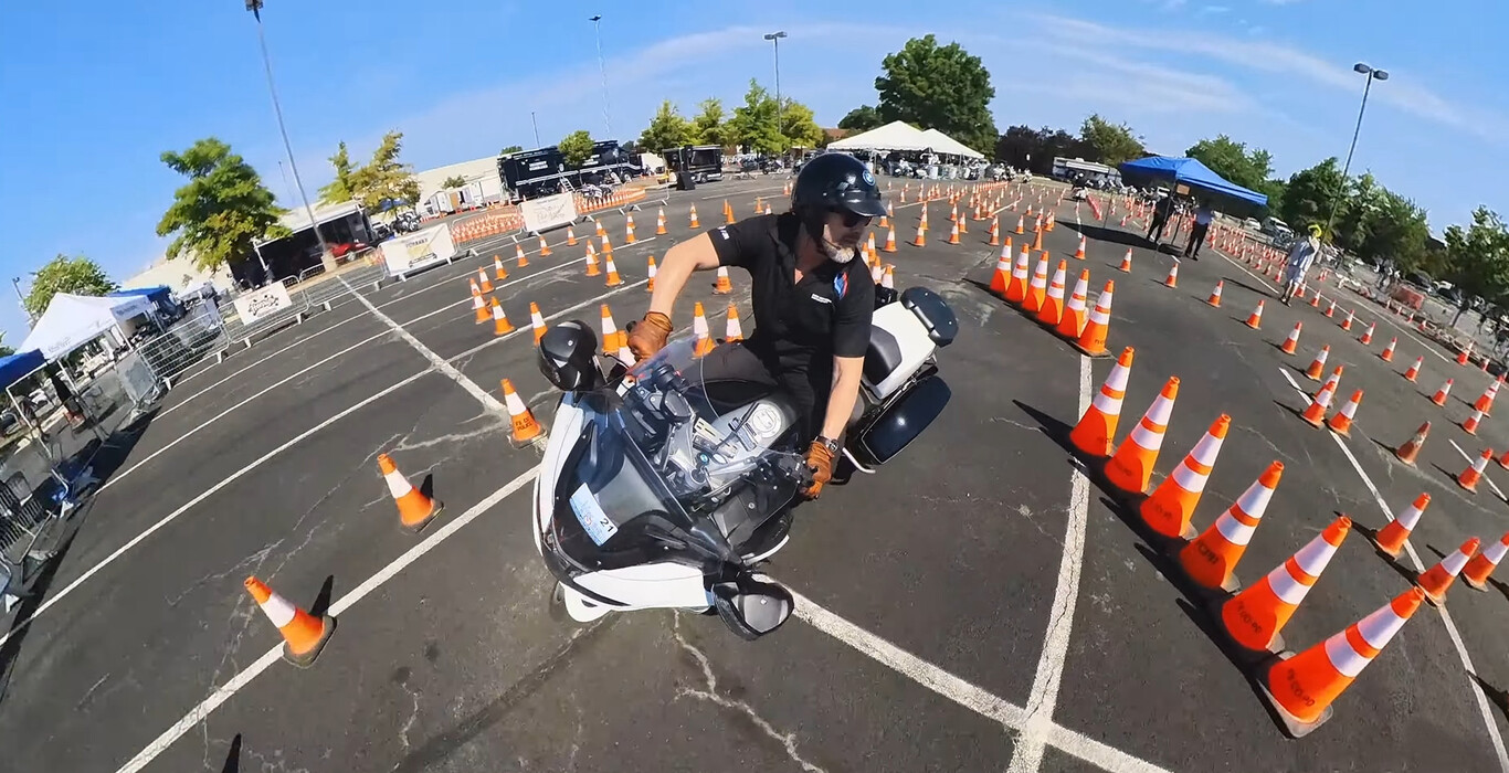 "Hice casi el mismo curso cuando era motorista, excepto por las curvas largas y cerradas. Tienes que trabajar ese embrague en el momento de cerrar la curva. Lo mismo en una salida de 140 grados. Si aprietas el embrague a fondo en una maniobra cerrada, te hundirás. Cuando lo tomé por primera vez, estaba en una KZ-1000. Era un curso de cinco días. Con el tiempo, se redujo a 3 días. Varios años después, pasamos a las Harleys".