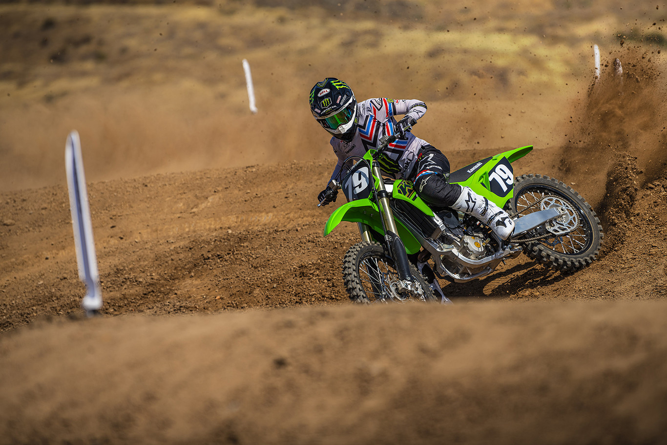 La Kawasaki KX450, por su parte, dispone de mejoras puntuales, como un faldón del pistón con un nuevo recubrimiento lubricante de película seca para reducir la fricción, además de un reajuste del embrague hidráulico, con lo que se pretende que tenga un mejor tacto y una mayor vida útil. También gana de serie un manillar Renthal Fatbar, de 28,6 mm de diámetro y terminado en aluminio, que ahora está en una posición 19 mm más baja y 8 mm más cercano al piloto, en un intento de facilitar la carga de peso en la rueda delantera.
