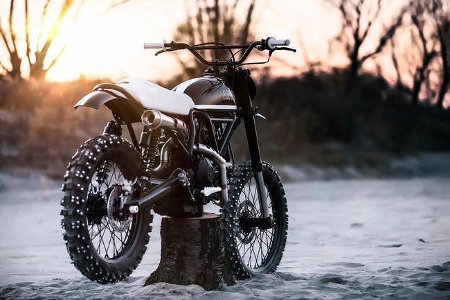 La Ducati Scrambler R/T (siglas de Road y Track) es la vuelta al Motocross más setentero. Para ello, los preparadores de Anvil Motociclette la han dejado lo más sencilla posible, utilizando incluso un tanque de la Ducati Scrambler de la época. Un manillar de Motocross, las suspensiones revisadas y unos neumáticos de 19 pulgadas off road son algunos de sus detalles más característicos. La placa, con el número 53, representa los días que han tardado en prepararla.