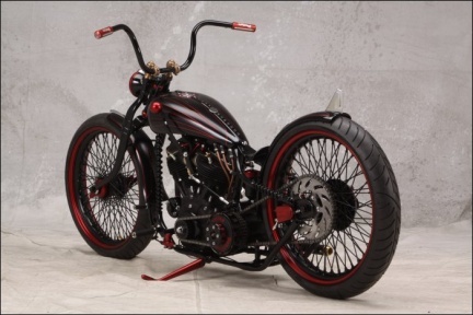 En el apartado Harley Davidson modificadas encontramos una moto fabricada en España, aunque su diseñador sea extranjero, Ferry Clot tiene su tienda en Marbella. La moto se llama Parafina, y está basada en una Harley Davidson Panhead de 74 pulgadas cúbicas de 1956 a la que se le ha montado una horquilla delantera de Springer de 1998 convenientemente modificada. Las ruedas también son de 23 pulgadas de diámetro, lo que contribuye a la imagen de toda la moto. Entre los detalles que me han llamado la atención está el freno trasero, que parece que esté integrado en la corona de la cadena, formando un todo-en-uno, y la cabecita del diablillo que asoma por la tobera de admisión de los carburadores.