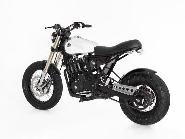 Así desarmaron por completo la honda Dominator original, que por lo que cuentan estaba bastante "averiada" y empezaron a obrar su magia. El motor fue enviado a un especialista paraque le diera un buen repaso, mientras ellos recortaban y re-soldaban el chasis y el basculante, que estiraron 5 cm. La horquilla original fue sustituida por la de una Suzuki DRZ 250, detrás se instaló un amortiguador Ohlins y un juego de neumáticos Bridgestone TW en medidas 14/180 detrás y 18/130 delante. También instalaron un escape nuevo y un depósito fabricado en metal. Los frenos ahora utilizan unos discos lobulados con pinzas Nissin. Los guardabarros son artesanales, igual que los reposa pies el asiento y los mandos del manillar. Por último el faro procede de una Harley Davidson e incluye una rejilla en acero inoxidable para protegerlo de la gravilla de las carreteras balinesas.