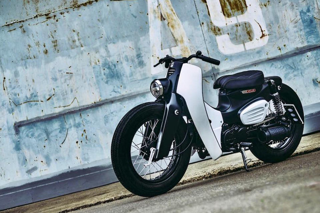 Si nos detenemos en la carrocería de esta pequeña custom, el panel frontal mantiene la forma original pero poco más se puede observar de los originales de la Super Cub. Los guardabarros han sido eliminados y la zona trasera ha sido recortada dejando un pequeño espacio cubierto. También se han añadido unos embellecedores de la horquilla que hacen que la moto de la impresión de ser una bestia mucho más fiera. La combinación de los colores blanco y negro mate hacen el resto.