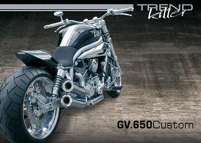 A mi, es que cada vez que veo un aparato de estos me sube un escalofrío por la espalda. Este aparato de moto, la Hyosung Trend Killer, es en concreto una modificación de la Hyosung GV650, a la que se le ha empolvado la nariz con piezas a medida, como las trasera de 240, escapes gemelos, barras de competición, un retoque completo al asiento y a la parte trasera, luces LED,... En definitiva, poco queda de la original, que la verdad, ahora se ve un poco tradicional y hasta algo sosa en comparación con esta.