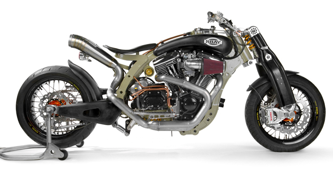 Avanzando en nuestro análisis no podemos evitar fijarnos en el chasis y sus líneas. Hecho en aleación de aluminio 6061T6 es la base que da forma al conjunto. De su rendimiento a la vista y en práctica depende todo el diseño. Éste aloja el alma de esta moto, su motor. Mención especial merece este apartado puesto que Sbay nos ofrece la posibilidad de elegir entre varios propulsores; Harley-Davidson, S&S, Total Performance o RevTech, desde los 1340cc hasta los 2100cc, teniendo en cuenta que cuanto mayor es la cilindrada menor es la fiabilidad. El último encargado de llevar a buen puerto la explosión son unos escapes artesanales que lucen magníficos al desnudo. Llegados a la dirección que marcan los silenciosos vemos también un basculante hecho por la compañía en carbono y kevlar.