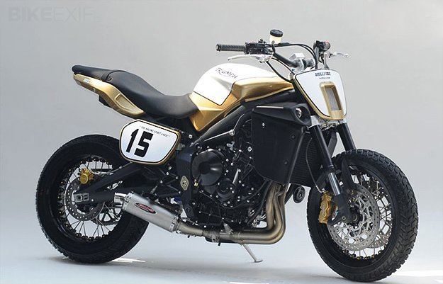 La Triumph Street Triple es una de las motos que he probado que más me ha gustado, sobre todo porque cuenta con un motor excepcional, que con sus tres cilindros proporciona la potencia de un cuatro cilindros con la manejabilidad de un dos cilindros. De hecho tengo un amigo que se compró una de estas siguiendo mi consejo. Pero, siempre hay alguien que es capaz de mejorar lo inmejorable, como es el caso de esta Triumph Hellfire flat tracker.