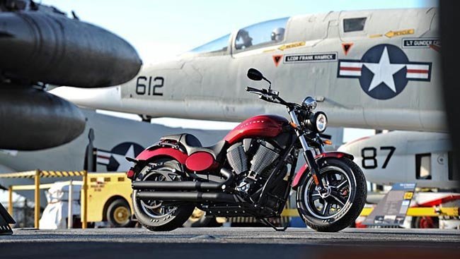 Si, los chicos de Polaris Industries ya han presentado un modelo de la gama 2013 que además estará a la venta el próximo mes de abril en USA. La Victory Judge aspira a ser una Muscle Bike para reinar en el mercado norteamericano frente a sus primas hermanas de Milkwaukee. Para ello han cogido el motor Freedom 103/6 de 1.731 cc y a su alrededor le han montado una moto de esas que sólo se hacen en esa parte del mundo. Con un faro redondo de línea clásica, llantas de 16 pulgadas y cinco radios de aleación, manillar bastante plano y unas ruedas que, para el canon establecido, podríamos decir que hasta son estrechas. Porque un 130/90 delante y una 140/90 detrás parecen poca goma en comparación con lo excesivo del resto de la moto.