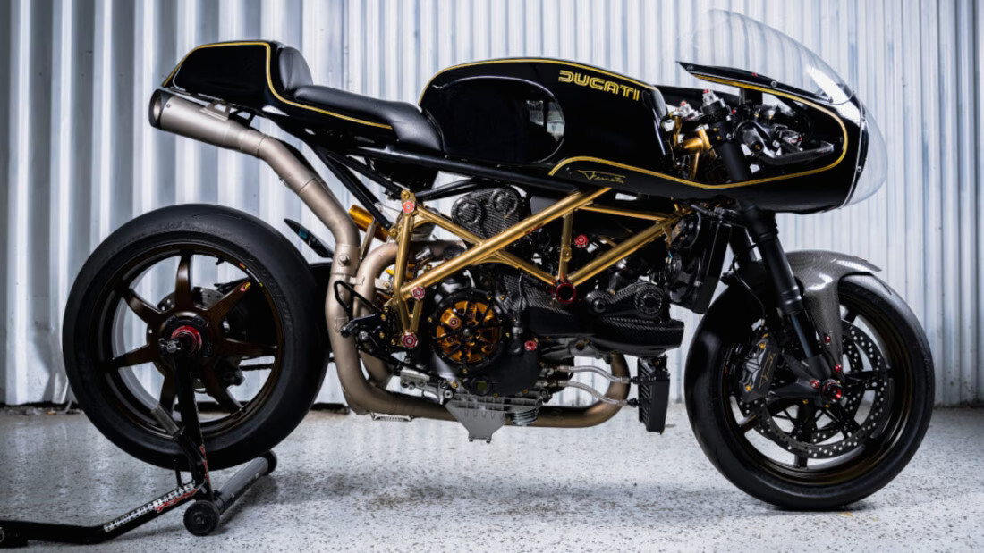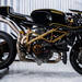 De la moto original no quedaba mucho. Reemplazó todas las piezas por repuestos originales italianos, y recubrió la moto con una pintura cerámica, dejando atrás el amarillo vistoso de la 1098 para dar paso a un negro clásico con detalles dorados.