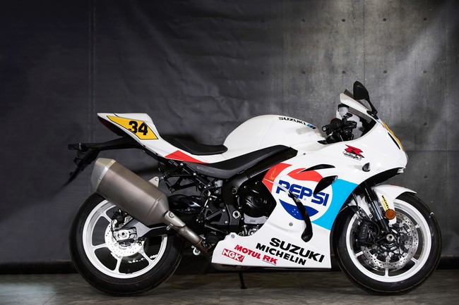 La superdeportiva japonesa de última hornada abandona sus colores comerciales para convertirse en una máquina que mira a su pasado, concretamente a 1993 cuando la Suzuki RGV500 se alzó con el título en manos del mítico piloto tejano, aunque la decoración de Pepsi fue usada en 1988-89. Aquella decoración en un color blanco impoluto manchado sólo por la publicidad de los refrescos y los portanúmeros en amarillo se teletransporta hasta nuestros días en la preciosidad que ves junto a estas líneas.