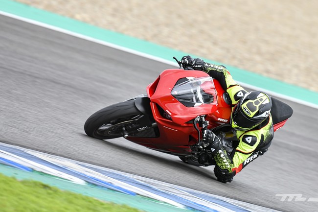 Pero no hemos venido hasta el Circuito de Jerez para dedicarnos a mirar una moto que sobre el papel promete mucho. Puede que sus cifras no llamen tanto la atención como las de sus hermanas mayores, pero eso nos da igual, queremos conocer de primera mano a qué sabe esta boloñesa sólo disponible en el intenso color rojo de Ducati.