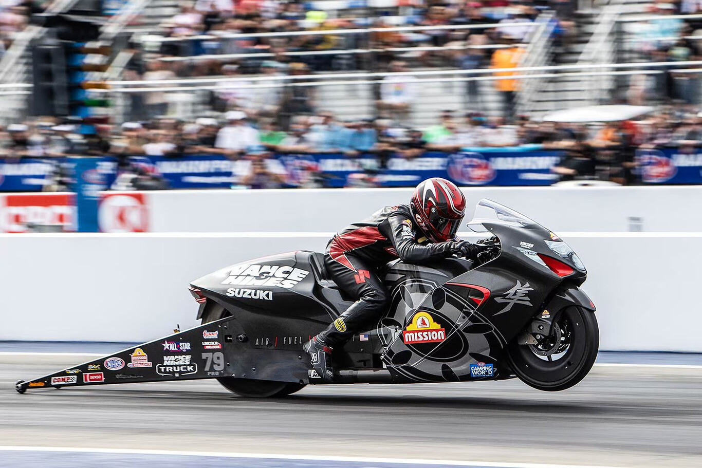 Primero pongámonos en contexto. La Pro Stock Motorcycle de la NHRA es una clase de carreras de drag race en Estados Unidos que lleva disputándose desde 1987. Es posible ver a Suzukis GS enfrentarse a motos de Buell, Harley-Davidson V-Rod dándolo todo... Llamativo cuanto menos. El equipo de 'Vance and Hines' es uno de los más legendarios de la categoría que lleva ganando desde hace años.