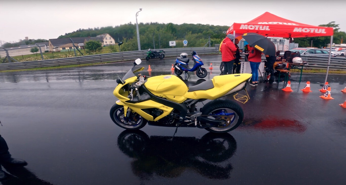 Su espíritu Yamaha sigue intacto, porque sigue teniendo una R1 aunque esta vez modificada para circuito (no sabemos si la misma). Sin ningún tipo de ayuda más que los neumáticos de lluvia, afronta la vuelta con sectores del circuito que están totalmente empapados hasta con charcos, mientras que otros están algo más secos por la rodada de otros vehículos.