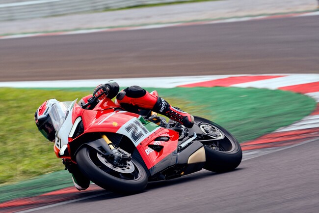 Comparada con la versión estándar, la Panigale V2 Bayliss 1st Championship 20th Anniversary también es 3 kg más ligera (de 176 pasa a 173 kg), gracias a la adopción de una batería de ión-litio y a la configuración monoplaza que recuerda el aspecto de la moto de carreras (aunque el asiento del pasajero y el reposapiés estarán disponibles en el equipamiento suministrado).