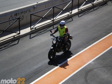 Mi primera opción era una MT-03, monocilindrica de 650 cc y 48 CV a 6250 rpm. Como ya os he dicho es una moto que me atrae mucho por su línea y el estilo que tiene. La moto me la ha dejado calentita Adrián que ha salido en la tanda anterior a la mía, y sin casi tiempo para darme cuenta hemos enfilado la salida de boxes al circuito. Creo que la sonrisa me daba la vuelta al casco, después de muchos años aisitiendo al circuito por fin conseguía pisar la pista por el lado de fuera del muro. Por desgracia la sonrisa no me ha durado mucho, porque en la primera curva a derechas me he tenido que poner las pilas para no perder la referencia del piloto que iba delante de mí.