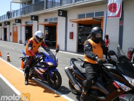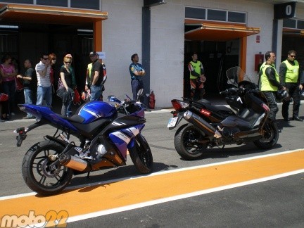 Tras recuperarme del esfuerzo mental y físico de las vueltas al circuito, volví, junto Adrián, y nos colocarnos a la cola, para seguir probando antes de que se acabara el tiempo contratado en la pista. En esta segunda "tanda" Adrián se pilló una T-Max 500 y yo me pedí la YZF 125 R de la que ya os había hablado aquí en Moto 22. Las impresiones de Adri sobre la T-Max fueron muy buenas, a pesar de que la moto no pasaba de 160 Km/h en la recta. Y las reacciones tampoco son las de una moto de marchas, donde cuando cortas el motor retiene, cosa que no hace el Mega Scooter a no ser que te apliques con fuerza a los frenos.