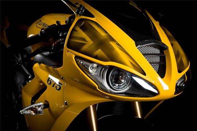 Efectivamente, nuestros lectores más british o tricilíndricos se habrán dado cuenta de que la decoración recuerda a la mítica Triumph Daytona 675 900 Super III de 1994 con esa tono bicolor amarillo y negro. A la actual le han añadido además dos bonitos gráficos en su frontal basándose en la bandera británica, la Union Jack. Se comercializará de foma limitadísima, tan limitada que sólo se fabricarán 75 unidades, todas ellas con su numeración pintada a mano en el depósito de combustible.