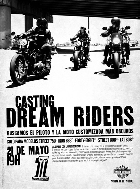 Harley-Davidson busca harlystas anónimos con la mejor moto customizada que representen el concepto Dark custom. Los que mejor representen esta imagen aparecerán en un libro con fotografías y sus perfiles. El próximo jueves 21 de mayo, a partir de las 19:00 horas, podrás acercarte al concesionario Harley-Davidson más cercano a tu casa (si vives en España y Portugal) para tomar parte en la Dark Custom Premiere Night.