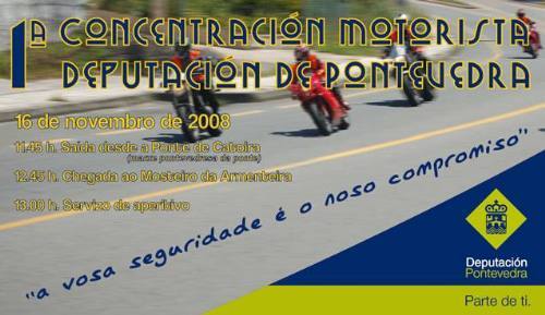 Cada día una cosa nueva me sorprende. Hoy le toca el turno a la Diputación Provincial de Pontevedra que ha organizado una concentración de motos. Como lo oís, bajo el lema (traducido) "Vuestra seguridad es nuestro compromiso", han citado a los moteros gallegos el domingo 16 de noviembre en Catoira. Desde allí la Diputación ha organizado una ruta hasta el Monasterio de Armenteira y a continuación servirán un aperitivo.