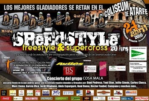 El sábado 24 se va a celebrar en el Coliseum de Atarfe, en Granada, el llamado Speedstyle. Este evento combinado de Freestyle y Supercross es en beneficio de APINME (Asociación Pro Investigación para la Reparación de la Lesión Medular). El precio es de 20 euros, cantidad que me parece bastante económica si tenemos en cuenta el destino de la recaudación.