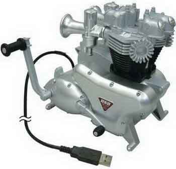 El cacharro es un hub USB 2.0 con tres conexiones y forma de motor clásico (yo diría que es un motor BSA o Norton de principios de los 60) con bastante detalle. Incluye una pata de arranque y palanca de cambio, que hace que el motor suene distinto cuando "cambias de marcha" además arranca, por supuesto, dándole a su pata de arranque. No se como andará se compresión, pero tener este hub al lado del ordenador haciendo ruiditos, no parece lo mas práctico, eso si, le dará un toque distinto a tu mesa por solo 44 euros.